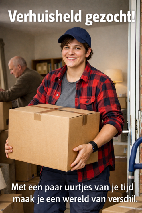 Wij zoeken sterke vrijwilligers die een paar uurtjes willen helpen met de verhuizing. Het inpakken wordt geregeld, maar extra handen zijn hard nodig. Spullen verhuizen, helpen inrichten, misschien een klein klusje zodat zijn nieuwe plek meteen warm en verzorgd aanvoelt.